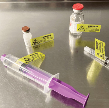 Maxpert Medical offers vibrant flag labels to help identify hazardous drugs in syringes, vials, and more without impeding any markings, bar codes, or other important information. The clear portion of the label wraps around the item while the yellow printed flag projects out, making the caution: hazardous drug warning easily viewable. The labels are stocked on a roll of 1,000 and can assist with hazardous drug safety and USP <800> compliance.